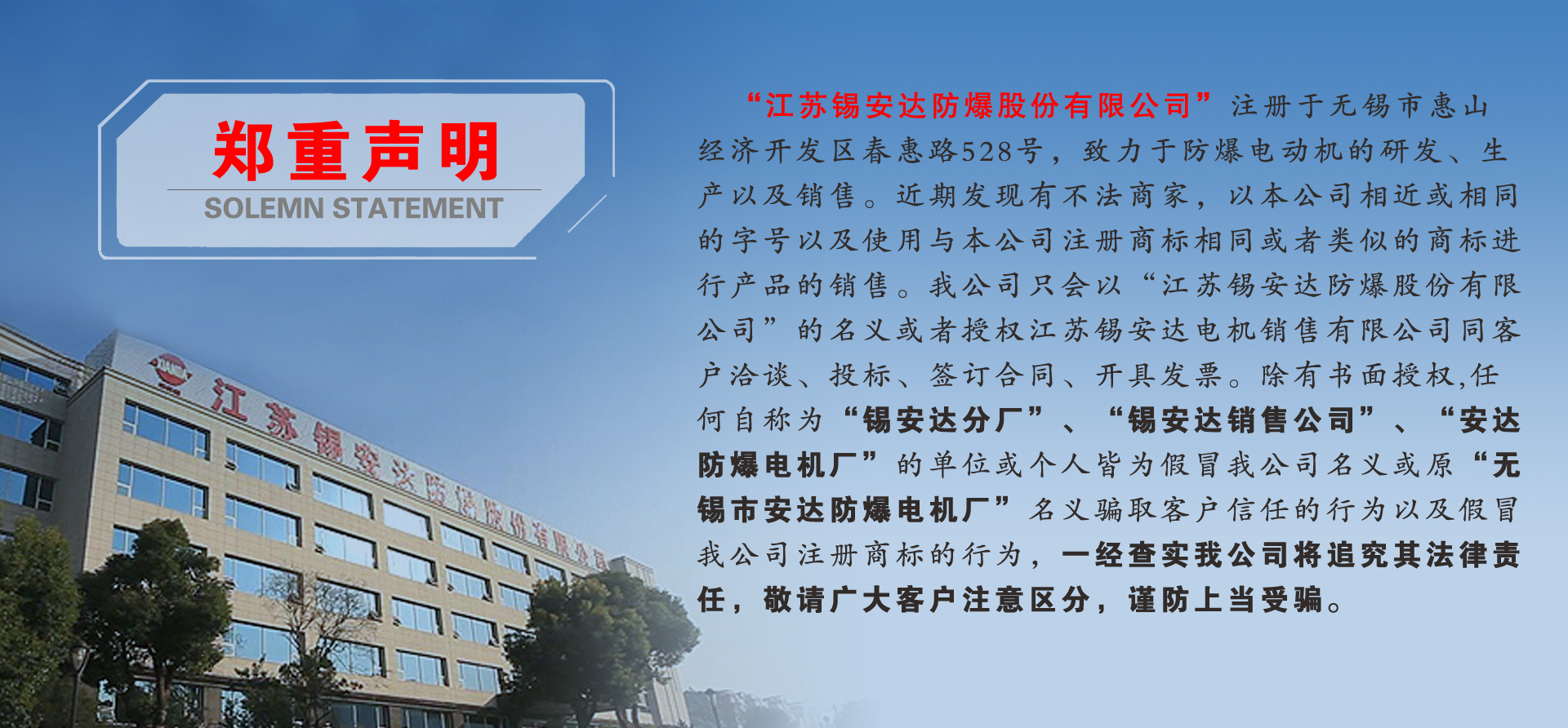 公司主要生產(chǎn)高低壓防爆電動(dòng)機(jī)和防爆電動(dòng)葫蘆,是中國防爆電機(jī)科研生產(chǎn)基地之一,占地面積11萬平方米,擁有現(xiàn)代化的生產(chǎn)車間、先進(jìn)的加工設(shè)備和完善的檢測能力。具有1000萬千瓦防爆電動(dòng)機(jī)和3000臺(tái)防爆電動(dòng)葫蘆的生產(chǎn)能力,注冊商標(biāo)為“錫安達(dá)”。產(chǎn)品主要用于石油、化工、煤炭、冶金、水利、電力、糧食、軍工等領(lǐng)域。