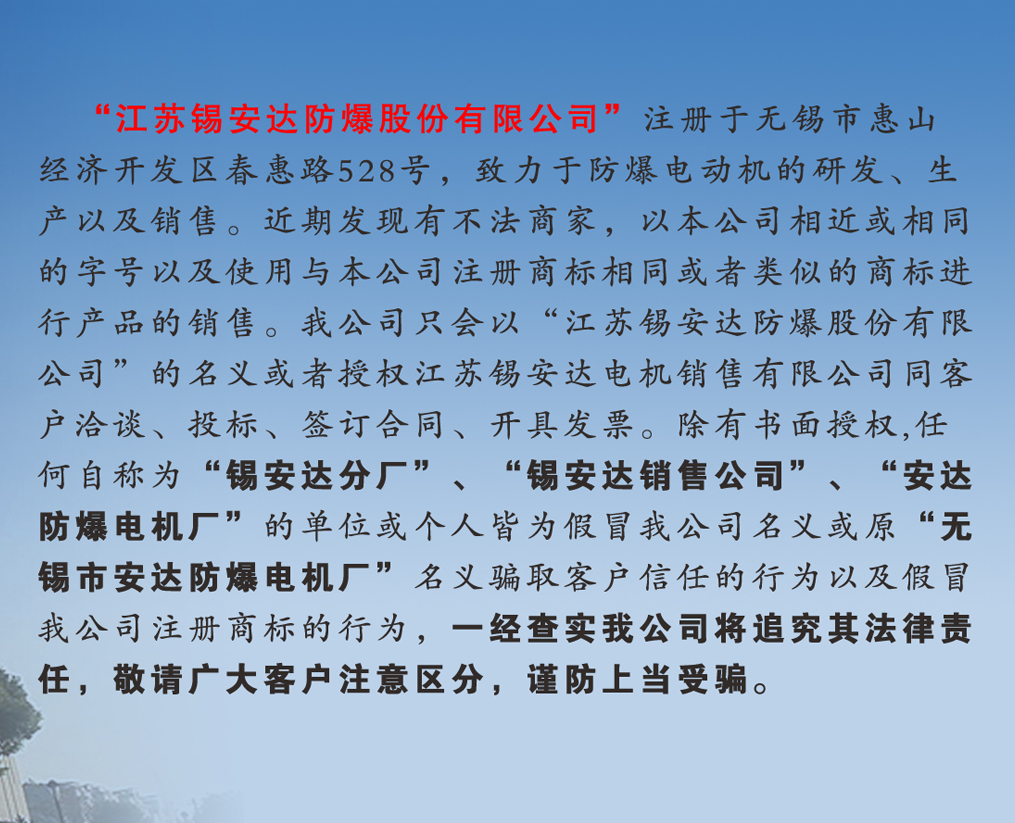 江蘇錫安達(dá)防爆股份有限公司由無錫市安達(dá)防爆電機(jī)廠和江蘇安達(dá)防爆機(jī)電集團(tuán)有限公司組建而成,從1986年起開始生產(chǎn)防爆電機(jī),是首批獲得全國工業(yè)產(chǎn)品生產(chǎn)許可證的防爆電機(jī)企業(yè)。